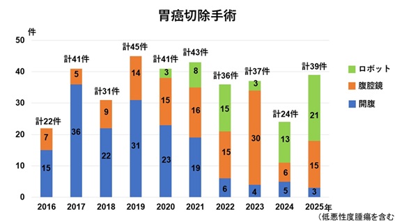 主に胃がんの治療を行っています。東予地域で最も胃がん手術件数の多い病院です。腹腔鏡下手術とはいわゆる傷の小さな低侵襲手術で、進行がんにも積極的に導入しており鏡視下手術の割合が増えてきました。胃の手術は食事に大きく関わるため、根治性だけでなく年齢や術後のQOLなどを総合的に考慮した治療を心掛けています。現在、当院では術後合併症軽減にメリットがあるロボット手術を標準術式としており、東予地域でロボット胃がん手術が受けられる唯一の病院です。