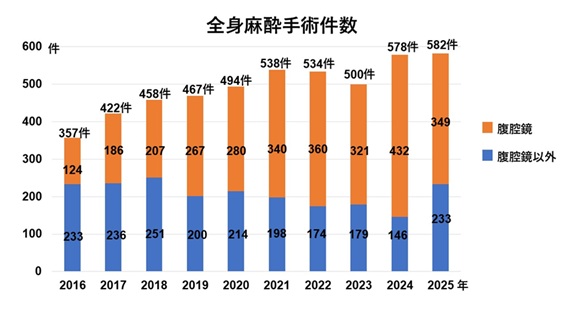 全身麻酔の手術件数は、がんの手術件数と緊急手術の増加を受けて近年増加しています。腹腔鏡手術が多いのも特徴で、東予地域で唯一ロボット手術を受けられる病院です。