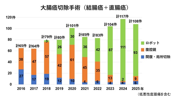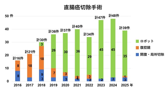 近年大腸がんの手術件数も増え、肛門温存を希望される方の受診も増えてきており、腹腔鏡手術の件数増加と、難易度の高いとされる直腸がんの手術割合が増えているのが当院の特徴です。ロボット手術では、学会認定プロクター(指導医)在籍施設となっております。当院の経験を生かして、他施設でのロボット手術の指導も行っております。当院のロボット手技の英語論文がAsian Journal of Endoscopic Surgeryに掲載されています。